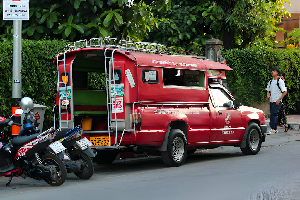Les taxis collectifs (songthaew) constituent également une excellente alternative pour 5 à 10 bahts par trajet. Ces pick-ups rouges à bancs aménagés circulent sur des lignes fixes. Pratique pour les courts trajets !