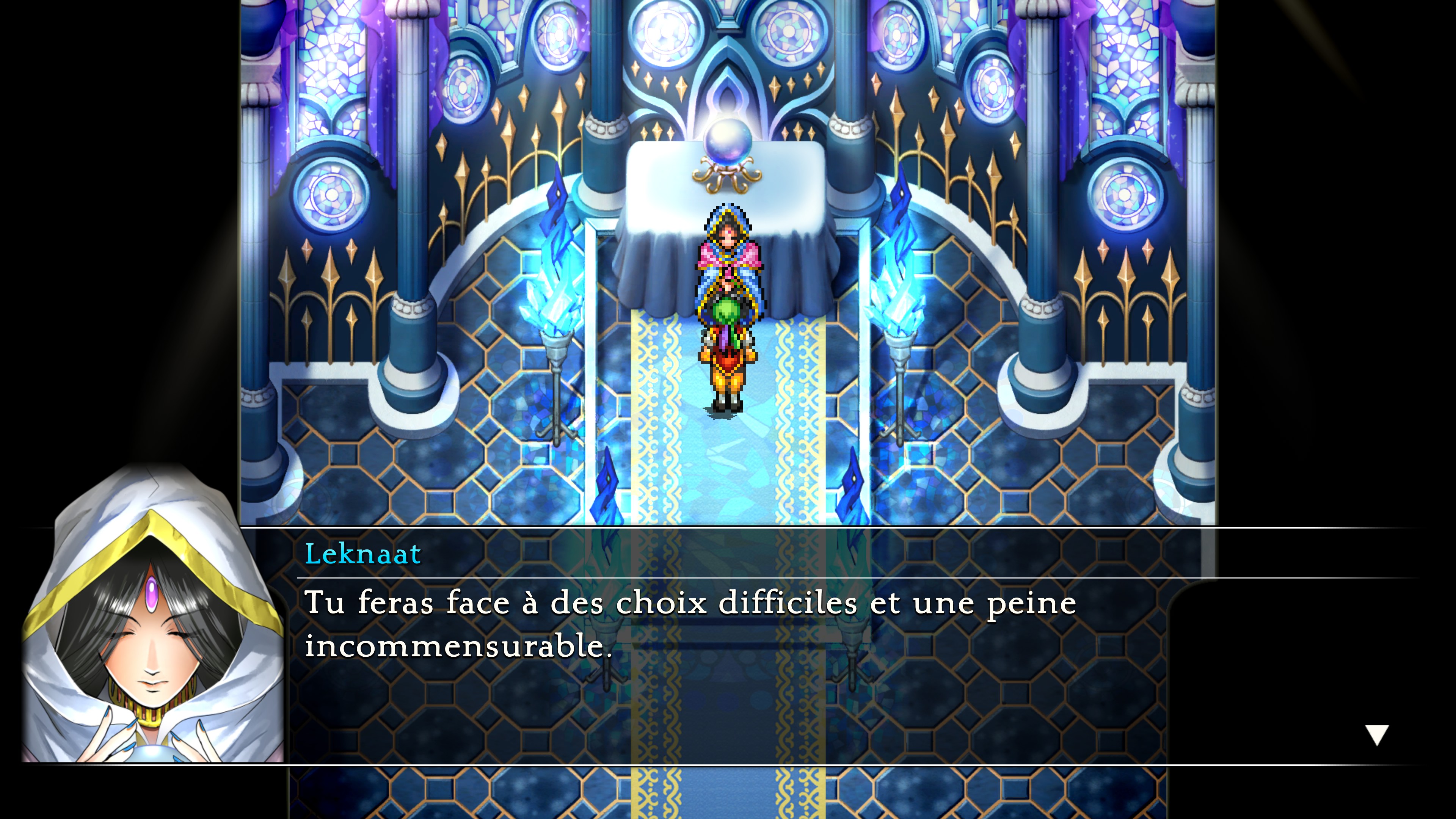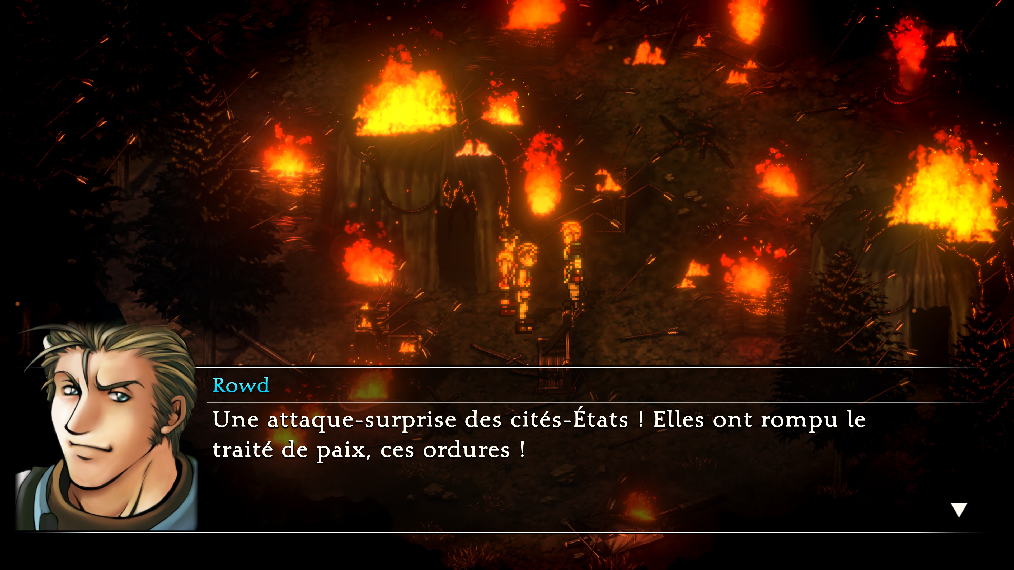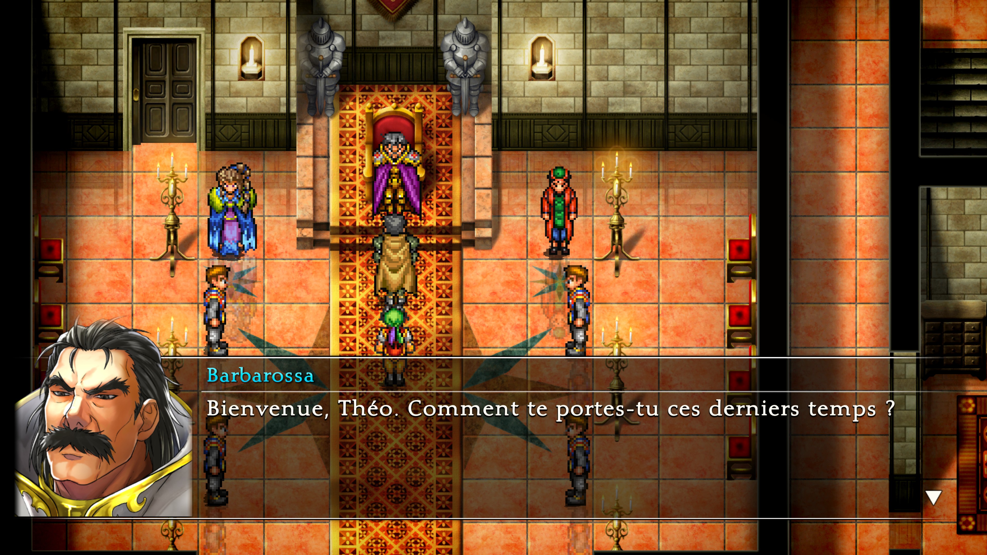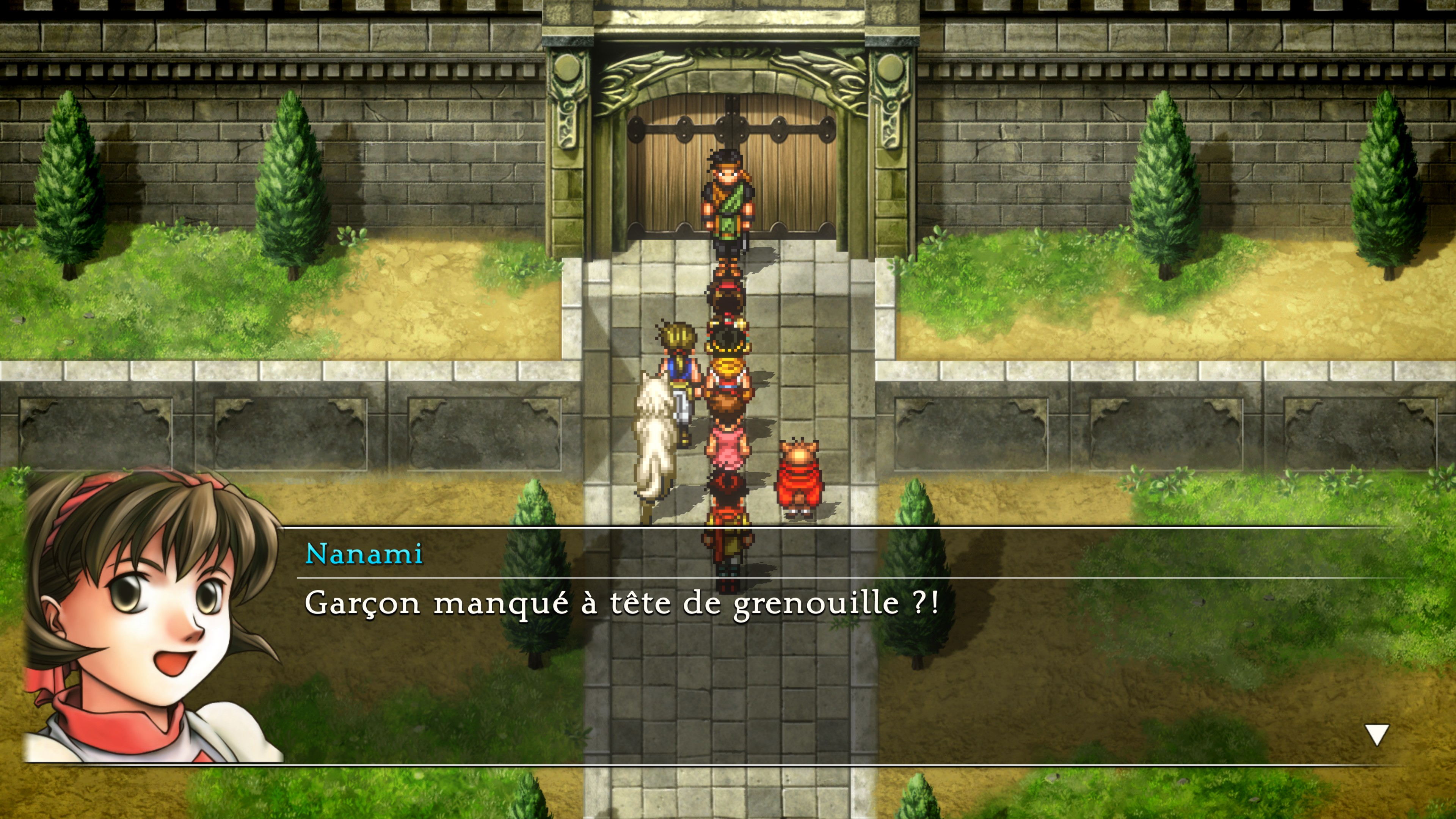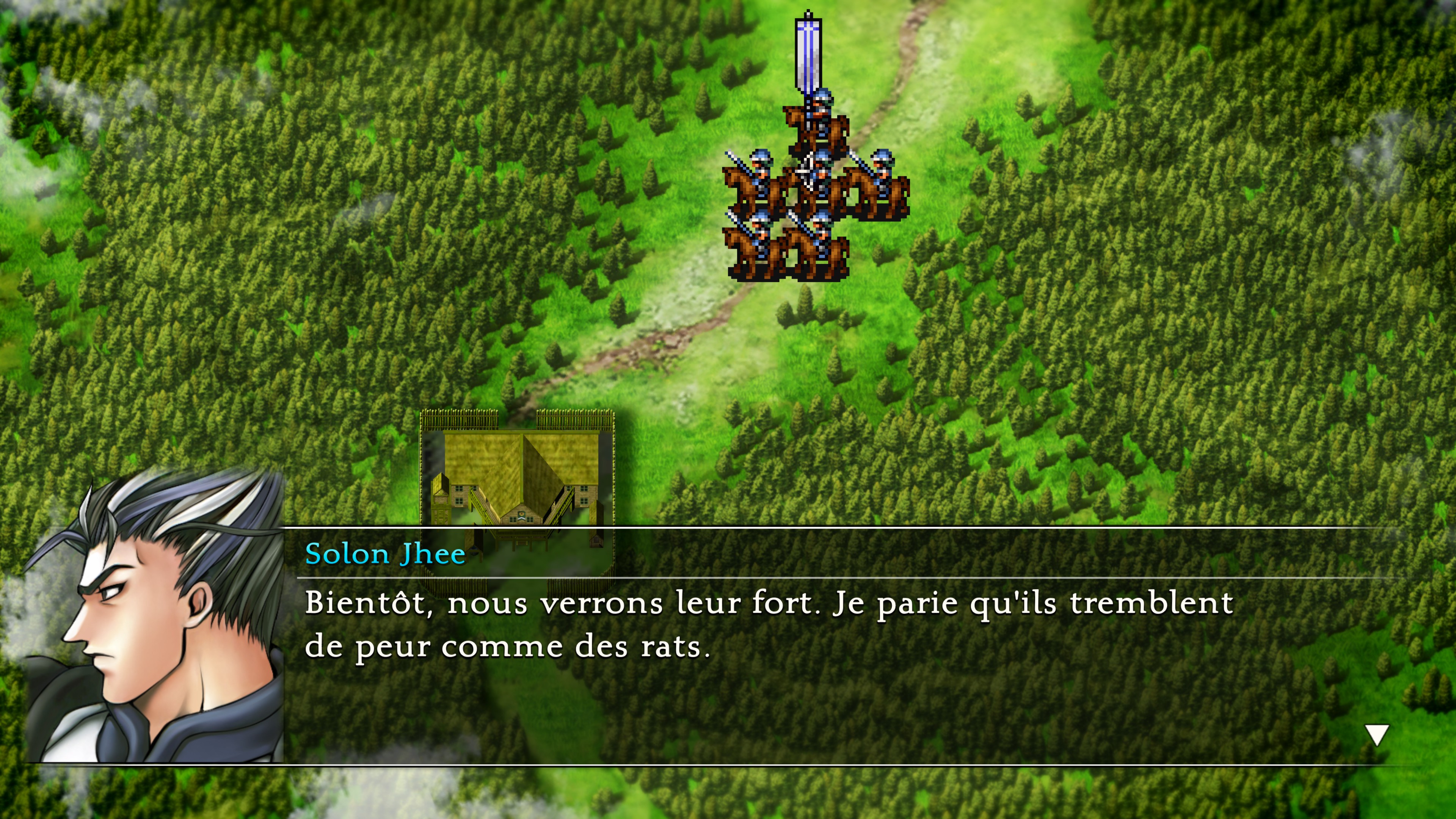 Si on veut trouver des changements dans ce remaster, au-delà de l’aspect visuel, c’est du côté du confort de jeu qu’il faut les chercher. Des modifications discrètes, mais tellement bienvenues. Tout d’abord, Sukoden I bénéficie pour la première fois d’une traduction française, enfin ! Ensuite, il est possible d’accélérer le déroulement des combats et si cela peut sembler gadget, celles et ceux qui connaissent les jeux originaux ont sûrement eu la larme à l’œil en découvrant cette possibilité. De base, les combats sont tellement lents que ça les rend indigestes, mais grâce à cette simple option, le monde s’illumine et tout devient plus agréable. Et jetons des fleurs quand c’est mérité, les développeurs ont corrigé la vitesse de la musique qui accélérait en même temps que les combats, ce qui devenait vite infernal. Faute corrigée, faute pardonnée. Et ce ne sont pas les seules modifications qui changent la vie.